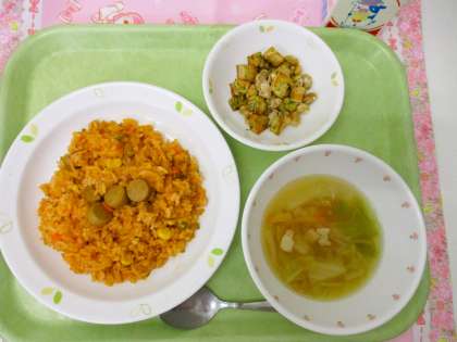 今日の給食は、<ジャンバラヤ>です。ジャンバラヤは、アメリカ南部ルイジアナ州の郷土料理です。スペインの料理のパエリアに起源があると言われています。ジャンバラヤは、チリパウダーのような辛みのあるスパイスが効いた混ぜご飯です。今日は、子どもたちにも食べやすいように、スパイスは控えめにアレンジして作りました。少し出来上がりの量が多く心配していましたが、どの学級もとてもよく食べていたのでよかったです。