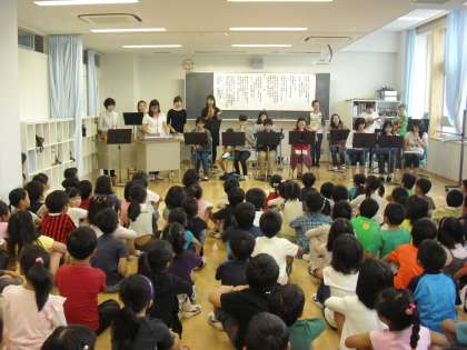 読み聞かせの後には、キーボードやウクレレ、リコーダーなど様々な楽器で「ゆめびより」の演奏をしてくださいました。すてきな演奏に、子どもたちの歌声が合わさり感動的な音楽となって教室に響きわたりました。