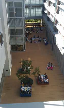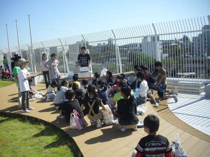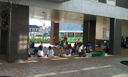 パックに入ったおいしいお弁当を、前庭・ピロティー・屋上・スマイルデッキ・特別教室・体育館・ランチルームなどの場所で、1年生〜6年生までが一緒に食べました。