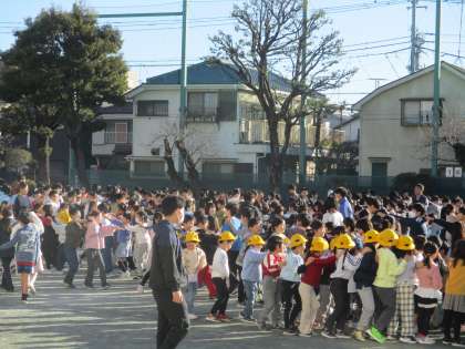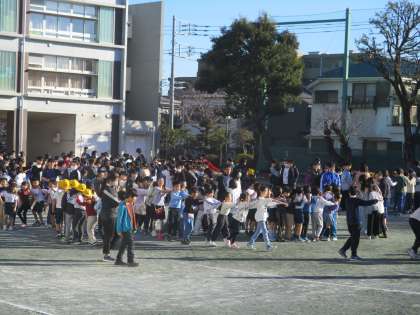1月30日の朝の時間に全校児童が校庭に集まって集会がありました。集会委員会の児童の進行のもと、じゃんけん列車をして楽しみました。