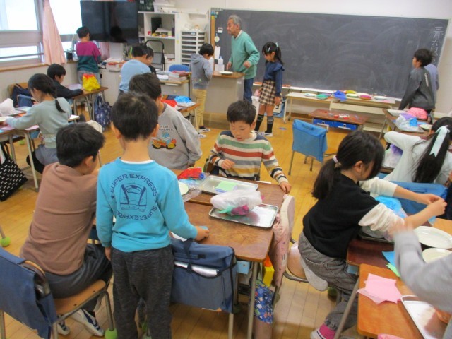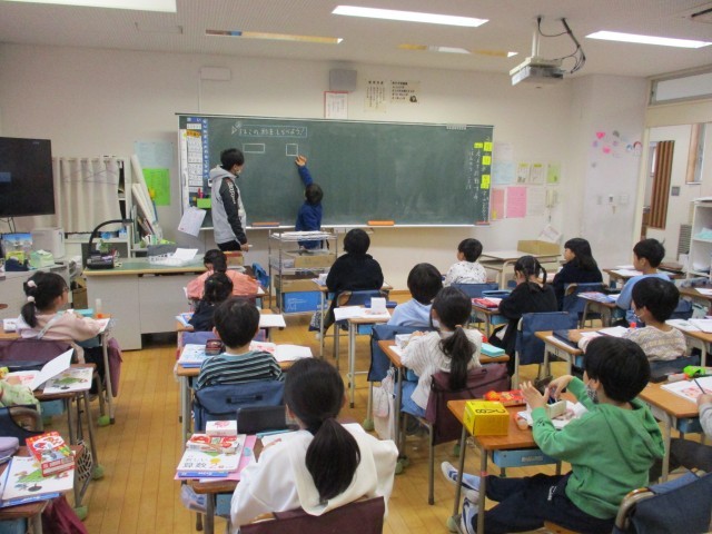 1年生外国語活動、2年生算数、2年生図工の学習の様子です。2年生算数では、「はこの形」で直方体の辺や頂点などの特徴について学習をしていました。