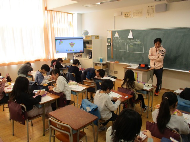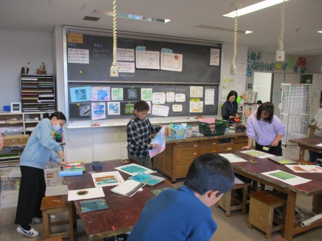 3年生算数、3年生算数、5年生図工の学習の様子です。5年生図工では、めあてを「版画の刷り方を工夫しよう」にして取り組んでいました。