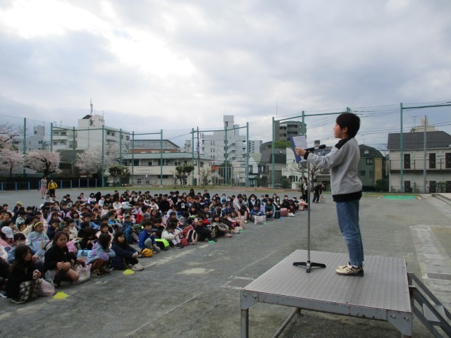 着任式に続いて、始業式を行いました。6年生代表の児童が堂々と代表の言葉を述べました。その後、担任の発表がありました。どの学年も進級し、立派な態度で式に臨むことができました。