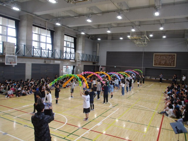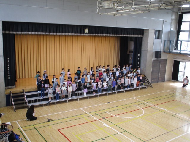 6年生が1年生と手を繋いで入場しました。前年度の計画委員の児童が司会進行しました。前年度の集会委員の児童が考えた全校クイズで大いに盛り上がりました。1年生の出し物は、入学後の短い期間で練習してきた「呼びかけ・歌」を披露しました。最後のポーズもバッチリでした。花のアーチは4年生が担当しました。全校で1年生の入学をお祝いする雰囲気がよかったです。