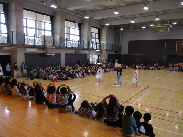 4月18日の朝の時間に、全校児童が体育館に集まって1年生を迎える会がありました。