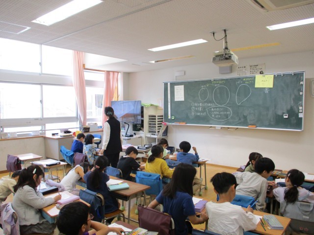 2年生生活、4年生体育、6年生図工の学習の様子です。6年生図工では、「マスキング、ステンシルの技法を学び、形や色の重なりを楽しもう」というめあてで「不思議なまちづくり」の学習に取り組んでいました。