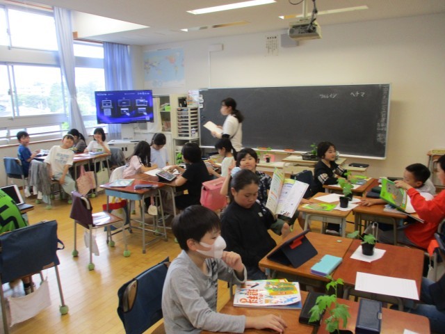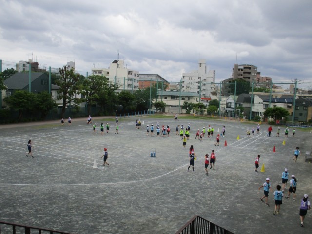 4年生理科、5年生家庭科、6年生体育の学習の様子です。6年生体育では、減速の少ないバトンパスをめあてにしてリレーの学習に取り組んでいました。