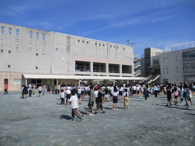 5月28日の朝の時間に、全校児童が校庭に集まりました。集会委員会の児童が企画したゲームに取り組みました。