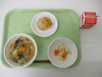 【今日の献立】*ほうとう*野菜の甘酢かけ*ごま入りりんごマフィン*牛乳【主な...