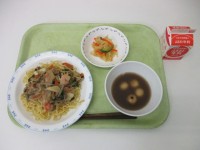 【今日の献立】*あんかけ焼きそば*野菜の中華風味*白玉しるこ*牛乳【主な食材...