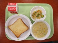 今日の献立*シュガートースト*コーンシチュー*香味ドレッシングサラダ主な食材と産...