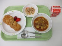 【今日の献立】*きなこ揚げパン*ボルシチ*ビーンズサラダ*くだもの(いちご)...
