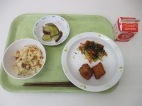 【今日の献立】*豚肉と昆布のごはん*いかのかりんと揚げ*野菜の乾物あえ*さつ...