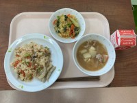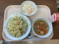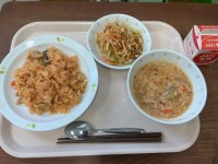 今日のこんだてチキンライスじゃがいものハニーサラダ卵とトマトのスープ牛乳