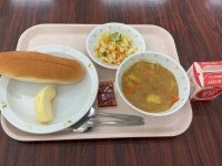 今日のこんだてコッペパンカレーシチューフレンチサラダくだもの牛乳