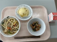 今日のこんだて味噌煮込みうどん野菜のからしじょうゆかけさつまいも入り蒸しパン牛乳