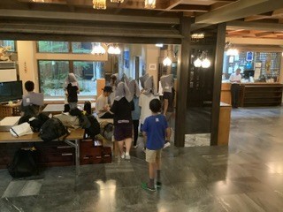 宿に入ってすぐに、避難訓練を行いました。