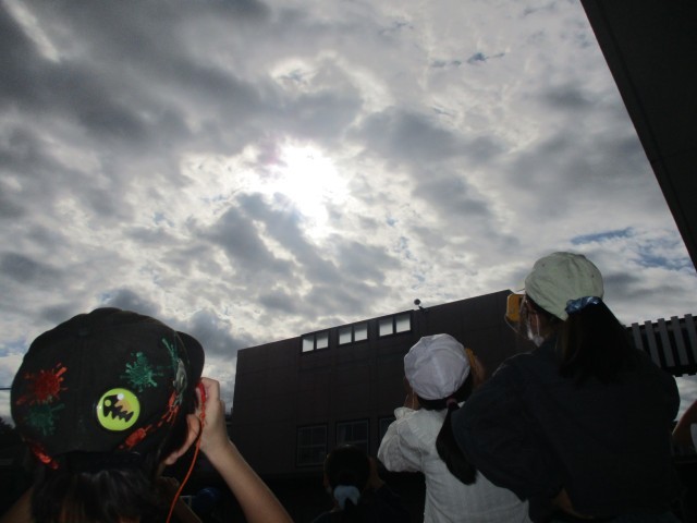 遮光板を通して見える太陽に、「うわぁ!とてもきれい。」「あっ!雲に太陽が隠れたけど、隙間から見える。」など感動の声が上がっていました。