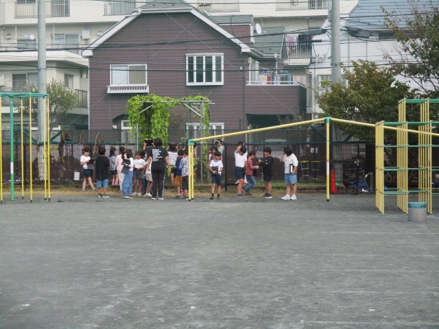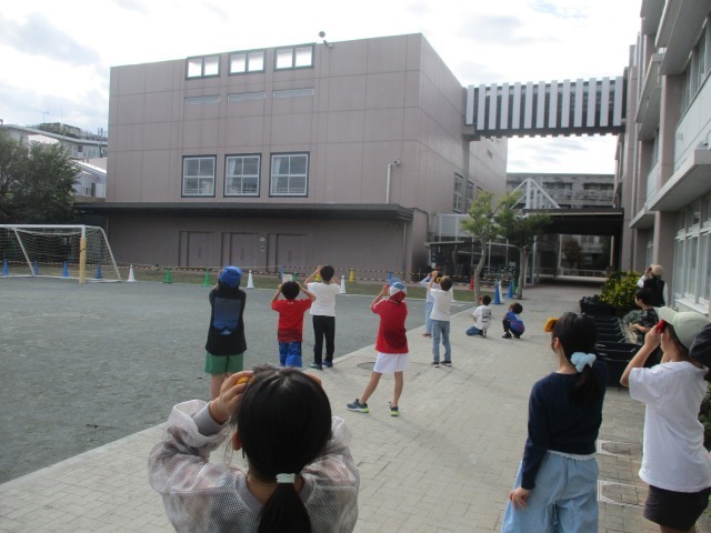 5時間目の校庭には、理科の学習で、太陽を遮光板で観察している3年生。大きく育ったヘチマの観察をする4年生。