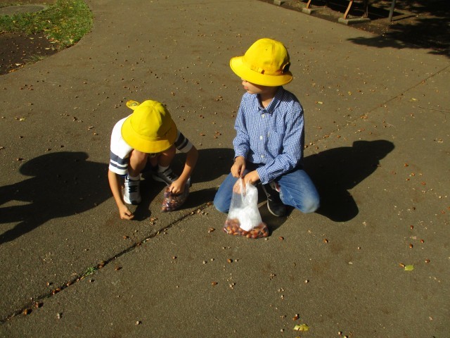 公園に着くとたくさんのドングリを見つけて、一目散に拾いに行きました。