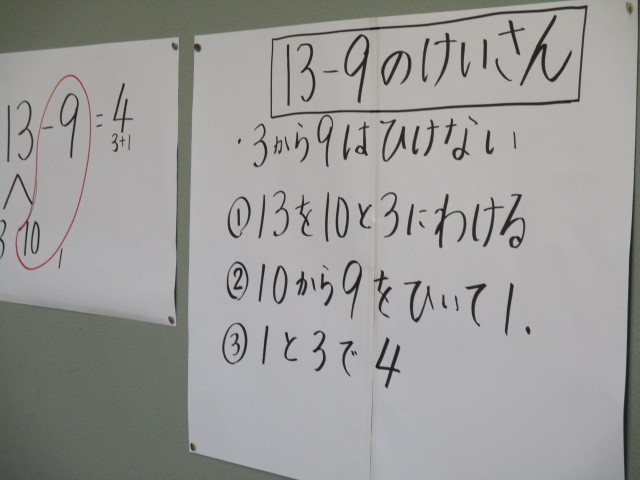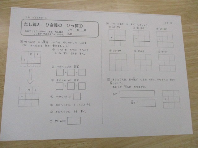 今日は、繰り上がりのひっ算の学習を、「①位をそろえよう。ではひっ算では、どこに数字を書くのかな?」と一つ一つ丁寧に確認しながら進めていました。