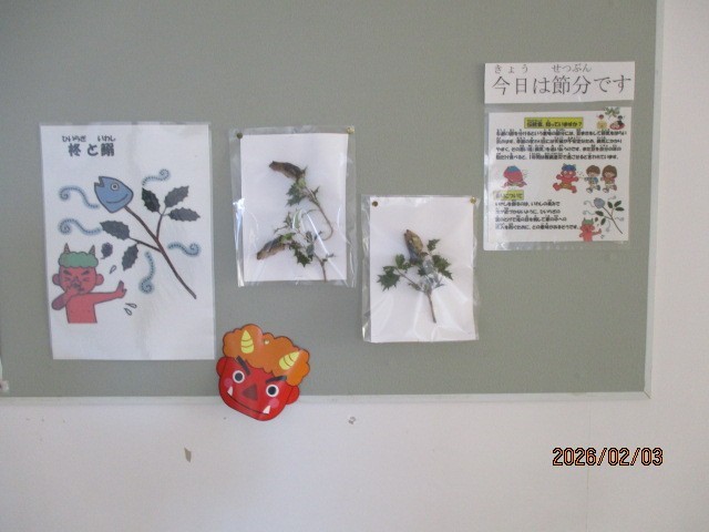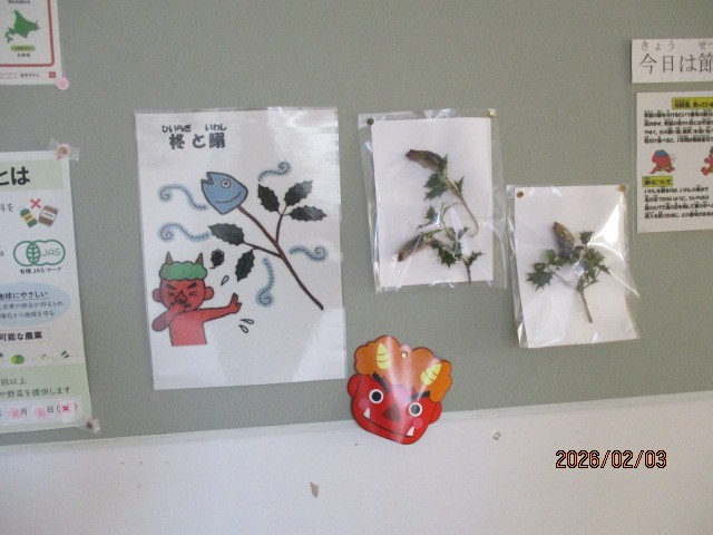 栄養士が給食室の掲示板にイワシとヒイラギを展示しました。