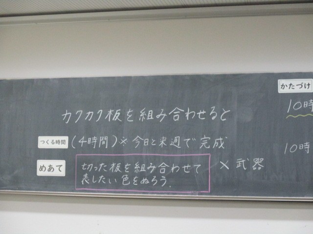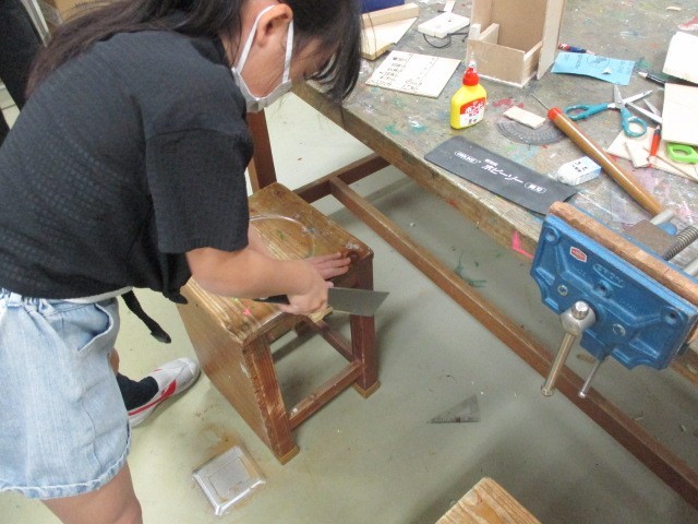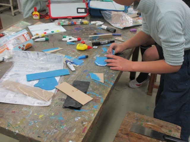 4年生が、板をのこぎりで思い思いの形に切り、色を付けていました。