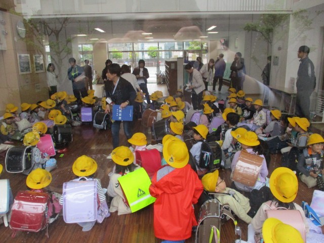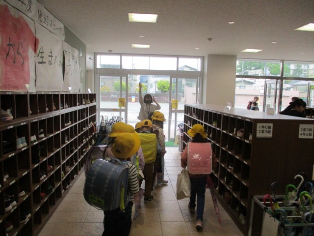 晴れの日は校庭に下校コースごとに並んでコースが間違えていないか一人一人の名前を確認してからの下校ですが、今日は、いちょうホールに並んで一人一人確認していきました。