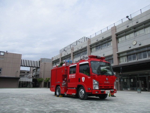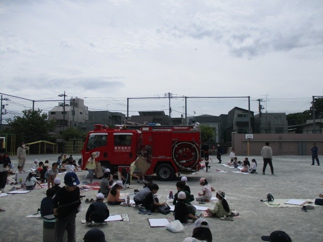 2時間目が終わったころ、黒い雲が空を覆いはじめ、天候が心配されましたが、2年生の子どもたちが校庭に出てくると、空の雲はどこへやら。光が差し込む暖かな校庭での消防写生会となりました。