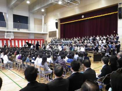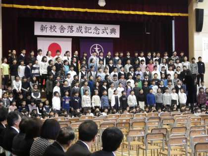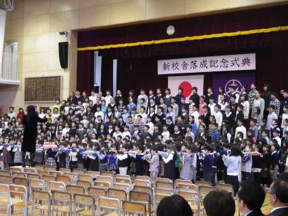 喜びの言葉は、全校児童が参加して行いました。5,6年生の合唱「光の中へ さあ君と」、3年生以上の呼びかけ、全校児童による「喜びの歌」。どれも、子どもたちのいっしょうけんめいな気持ちが伝わるすばらしいものでした。全校の子どもたちと教職員の気持ちが一つになって、落成の喜びと感謝の気持ちを伝えることができました。