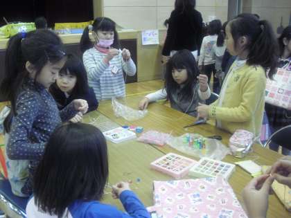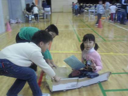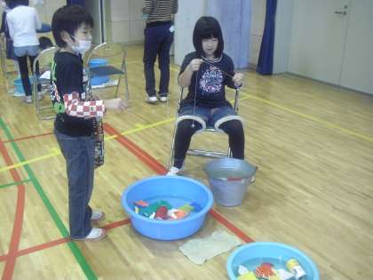 1・2年生合同で、生活科の学習「みんなで作ろうフェスティバル」を行いました。2年生は、昨年、1年生のときに、今の3年生に招待されてとても楽しかったことを思い出し、「今年は自分たちが1年生を楽しませる番だ!」と張り切って準備してきました。本番は、1年生にとても喜んでもらえて、満足そうな様子の2年生たちでした。お店は、おはじきゲーム、似顔絵ボーリング、アクセサリー作り、レーシングカー、トロッコ、カンカンアタック、おもちゃ屋、めんこ屋、パターゴルフ、射的、スーパーボールすくい、の11のお店を出しました。体育館中にたくさんのお店が並び、お祭り気分いっぱいの楽しい時間になりました。