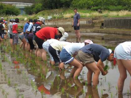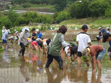6月4日(木)5年生が田植え体験をしました。本校では初めての行事です。神奈川県大井町下山田の農家の方々のご協力を得て、体験させていただきました。大井町では、町長さん、教育長さん、役所の方々が迎えてくださいました。田んぼでは、下山田の農家の方々10数名が子どもたちに丁寧に教えてくださいました。子どもたちは、素足で田んぼに入り苗を植えていきました。始めのうちは、恐る恐るだった子どもたちですが、しばらくすると慣れてきてリズムよく植えていました。植え終わった田んぼを見て、「ぼくたちもたいしたものだなあ」「楽しかった」「また来たい」と感想をもちました。農家の皆さんにお世話をしていただき、9月ごろ収穫に伺います。
