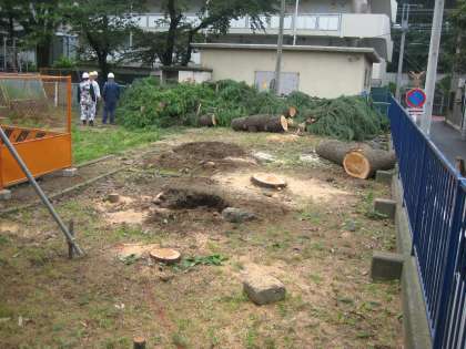 工事は、西門付近の樹木を伐採したり移設したりすることから始まりました。長年親しんだ樹木がなくなってしまうことは、大変さびしい気持ちです。作業場所にはガードマンがいますが、これからトラックの出入りが多くなりますので、通行に注意してください。