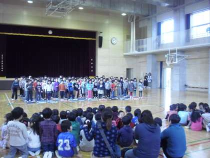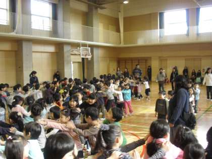 学校公開中の24日(木)に、1年生と幼稚園・保育園の年長児との交流会を行いました。1年生は元気よく歌い、鍵盤ハーモニカを演奏して迎えました。その後、「ジャンケン列車」や「もうじゅう狩り」をして遊び、150人近くの子どもたちが体育館で元気に活動しました。最後に、手作りのペンダントをプレゼントし、校舎案内をしました。