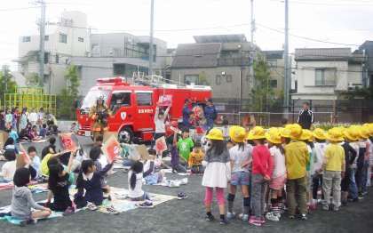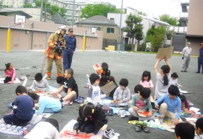 前もって画用紙にかいた火事の様子に、クレヨンで車や消防士さんをよくみながら、想像したことも加えてかきました。途中で1年生も見学にきて、2年生はもっとやる気がでたようです。作品は5月中に学校に展示予定です。お楽しみに!