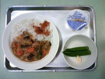 今日は、トマト・かぼちゃ・なす・さやいんげんを使ったカレーと付け合せのオクラで夏野菜をたっぷり食べられるメニューです。旬の野菜は栄養価が高く、価格は安いので給食でもたくさん利用しています。
