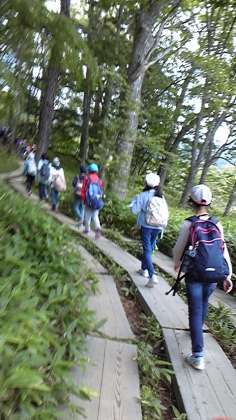 快晴です。青空が広がっています。朝一番で華厳滝に行きました。途中のバスの中から親子の鹿を見つけ歓声があがりました。そして竜頭の滝からハイキングです。緑の木陰の中を歩きました。戦場が原では男体山がくっきりときれいに見えました。湯滝を見て湯の湖を目指しました。出会った人に大きな声で挨拶をして進みました。元気いっぱいです。