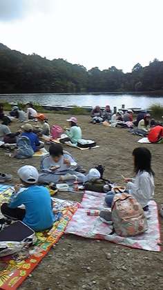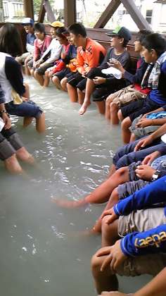 湯の湖畔に到着しお弁当。その後、硫黄温泉の足湯で疲れた足を癒しました。源泉では10円玉をひたして変化を確かめました。宿に帰り夕食を食べると元気回復。肝試しでワクワクドキドキの夜でした。