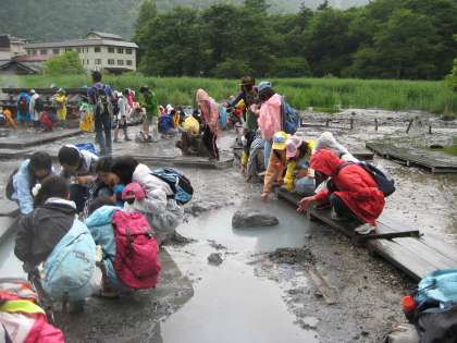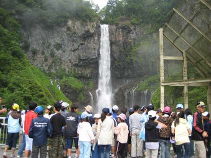 8月2日(日)日光林間学園2日目です。全員元気です。朝食後すぐにバスに乗り、華厳の滝を見学しました。毎秒1,5トンの水量が落ち見事でした。その後、湯元に行き、いおうの匂いのする源泉に10円玉をつけて変化を調べました。そして、湯の湖の周りを歩き、湯滝からグループごとに小田代が原ハイキングに出発。日光の自然を満喫しました。途中少し小雨がぱらつきましたが、どのグループもよく協力してゴールまで歩ききりました。夜は、室内レクで楽しみました。グループの出し物に工夫があり、演技力もなかなかなものでした。