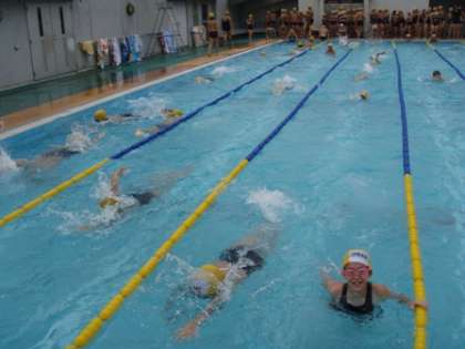 5・6年生合同で八幡山小学校に行き、プールをお借りして水泳記録会の練習をしました。記録会で泳ぐ種目を中心に練習しました。終わりに選抜リレーの練習も行いました。