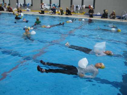 9月13日(金)6年生は、着衣泳を行いました。これは、万が一、誤って水に落ちてしまったらどうすればよいかを学ぶ授業です。衣服を着て靴を履いた状態で水に入ると、どんな感じになるのかを体験し、助かるためにどんな方法があるかを実際にやってみました。子どもたちは、水を吸って重たくなったシャツやジーンズを体感し「重たい!」「泳げない!」と驚きの声をあげていました。その後、ペットボトルやビニール袋で空気をためて体を浮かせる練習をしました。