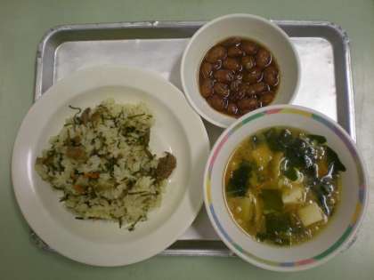 ・豚肉とごぼうのごはん ・牛乳 ・みそ汁 ・うずら豆 です。