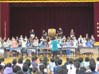9月27日は、6年生の学年発表集会でした。音楽の授業で学習した曲を合奏しました。曲名は「夏祭り」。和太鼓を交えて、祭りの賑やかな感じを表していました。迫力ある演奏に、5年生以下の子どもたちは、聞き入っていました。今から音楽会が楽しみです。