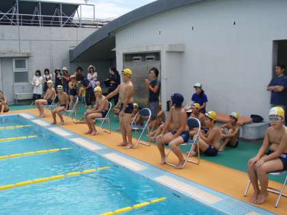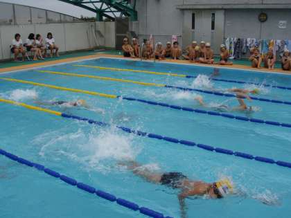 気持ちのよい青空の下、八幡山小学校の屋上プールをお借りして、5・6年生合同の水泳記録会が行われました。応援の態度もすばらしく、どの子も全力で取り組みました。