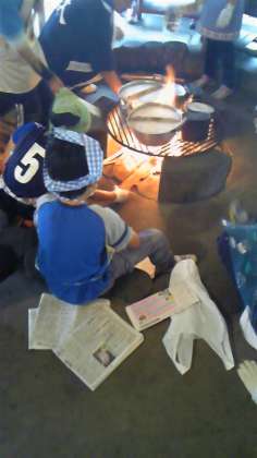 夕食は飯盒すいはんでカレーライスです。飯盒係、カレー係、火の係にわかれて準備をしました。1時間ほどで、どのグループもおいしいカレーが出来上がりました。午後つかんだますが焼き上がり、一匹ずついただきました。炭火で焼いたのでとてもおいしい味でした。