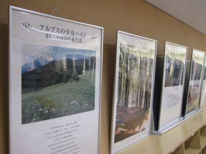また、世田谷文学館から移動文学館として、「アルプスの少女ハイジ」のパネル展をしています。図書室やえほんのへやにハイジの美しい世界が広がっています。