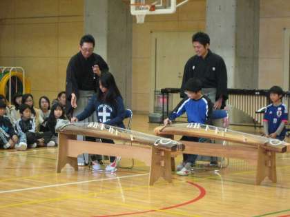 琴の演奏および作曲家である田辺明さん、尺八の演奏家である川村葵山さんの演奏、「春の海」が始まると、お正月の雰囲気が広がりました。尺八は、竹でできていることや一尺八寸の長さだから尺八ということ、琴は、13本の弦が張られていること、爪をつけて演奏することなどのお話を聞きました。その後、5年生の代表4名が、琴の演奏体験をしました。最後に、琴と尺八の伴奏で、校歌を歌いました。