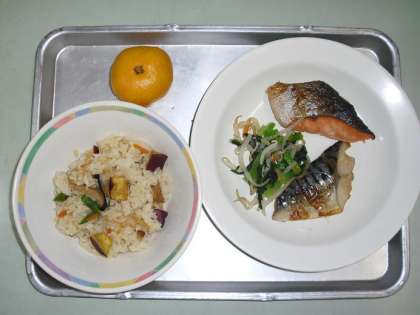 ・秋の香りごはん ・牛乳 ・鮭の塩焼きか鯖の塩焼き ・おひたし ・くだもの(みかん)です。