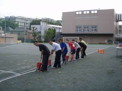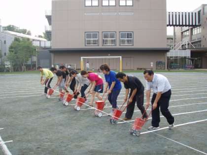 今、学校では雨の合間を見て、新体力テストを行っています。その種目の1つ「ソフトボール投げ」では、校庭にたくさんの等間隔のラインが必要です。しかし雨が降ると消えてしまいます。先生方は、連日、ライン引きの作業をしています。声をかけ合い、笑顔を交わし、汗びっしょりになりますが、頑張っています。先生方のチームワークです。