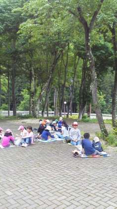 みんな元気にハイキングを終えました。昼食のおにぎりをパクパク食べています。少し雲って、涼しい風を感じます。